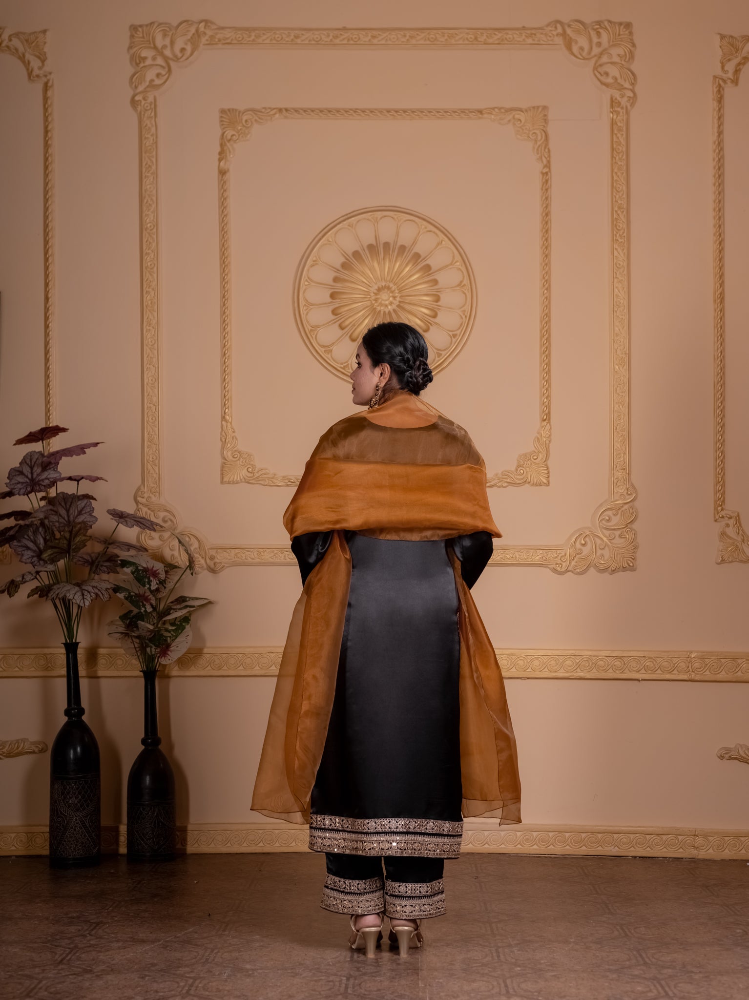 - Black satin A-line kurta with hand worked lace on neckline & sleeves